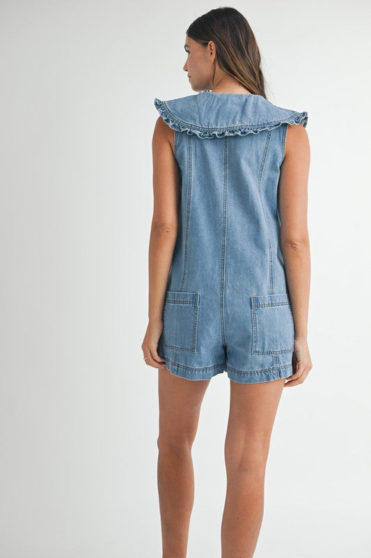 RUFFLED COLLAR BUTTON DOWN DENIM ROMPER